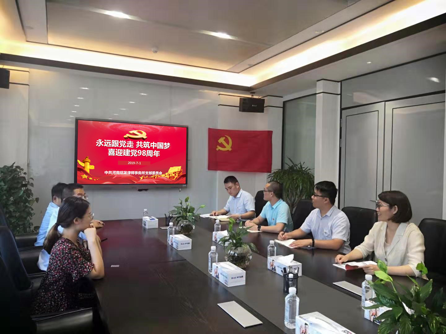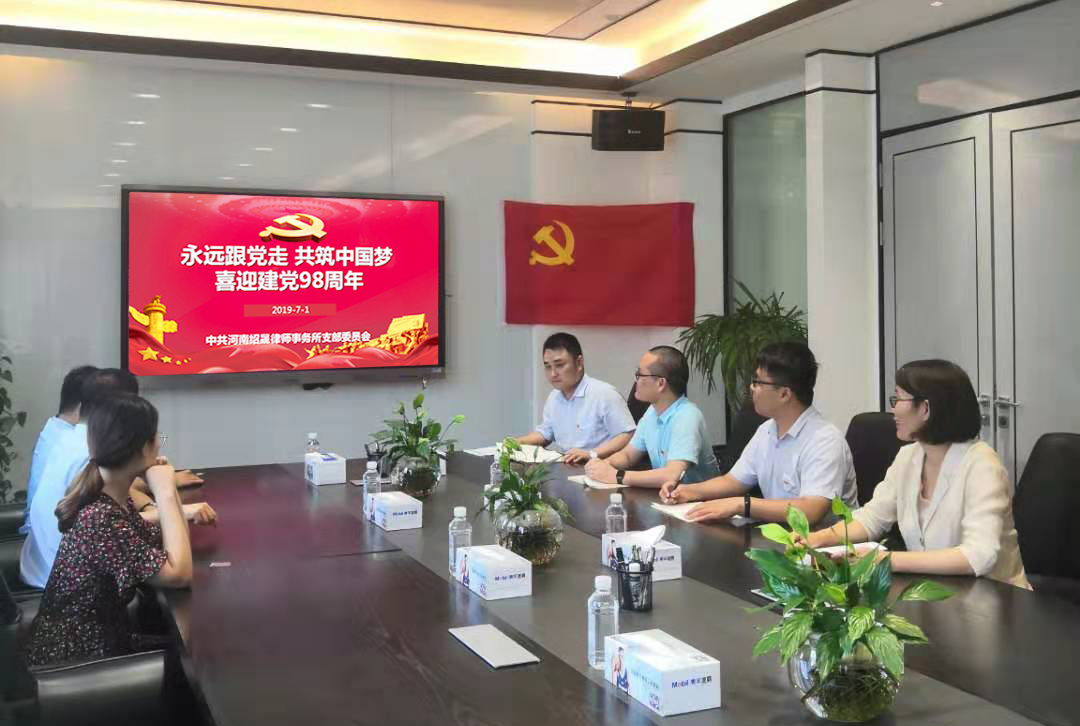 为深入领会学习“不忘初心、牢记使命”的精神内涵,迎接中国共产党建党 98 周年,增强党员意识,提高中共河南绍晟律师事务所支部委员会的凝聚力、向心力和战斗力,2019年7月1日上午十点,中共河南绍晟律师事务所支部委员会举办以“永远跟党走·共筑中国梦”为主题的党建活动,全所党员律师、其他律师和行政人员共同参加了这一会议。